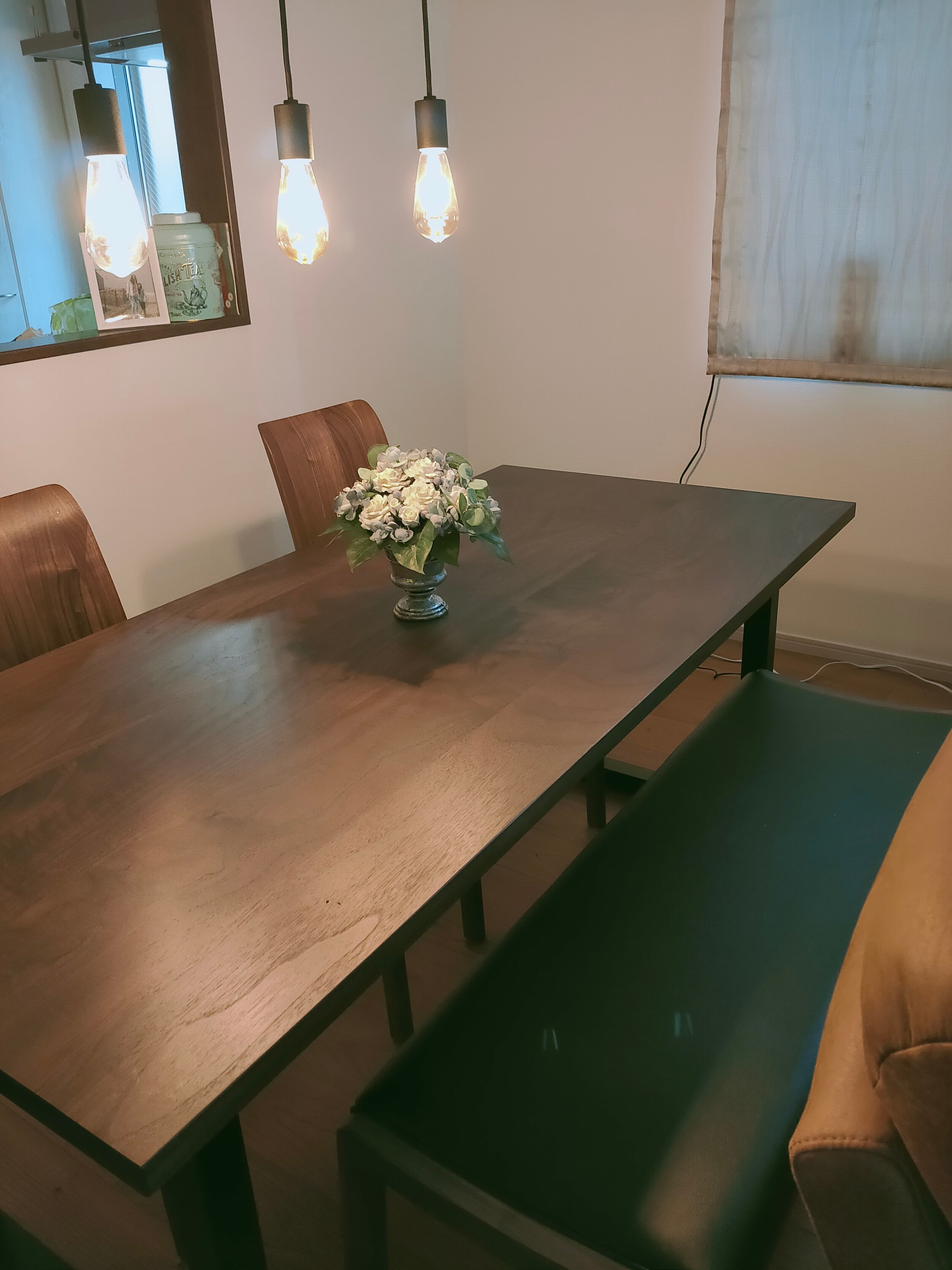 ウォールナット無垢材の天板で、厚みは3センチです,