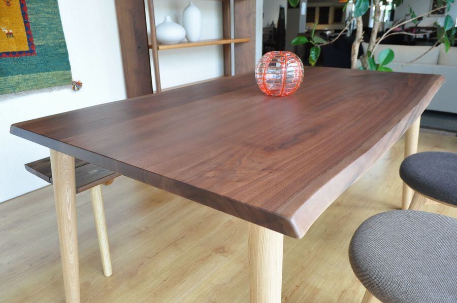 天板がウォールナット材、脚がタモ材でステキなデザインです。