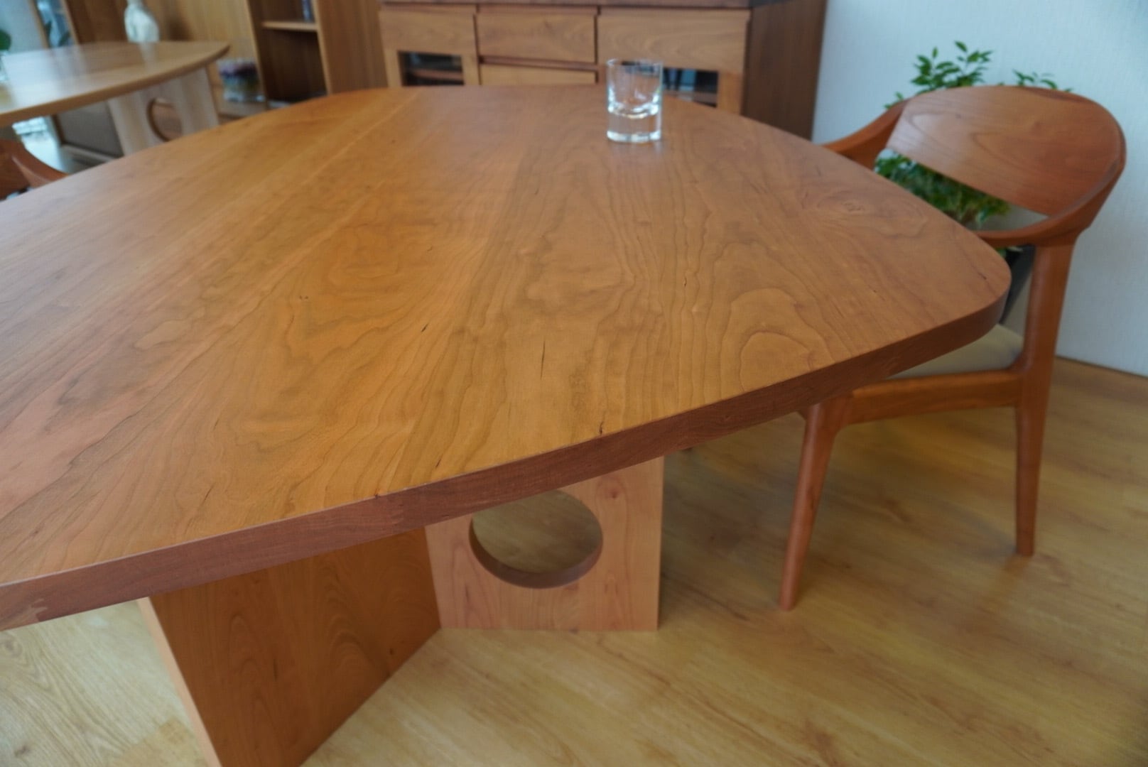 このような変形テーブルは、【突き板 合板材】で製作しているタイプも多いようです。