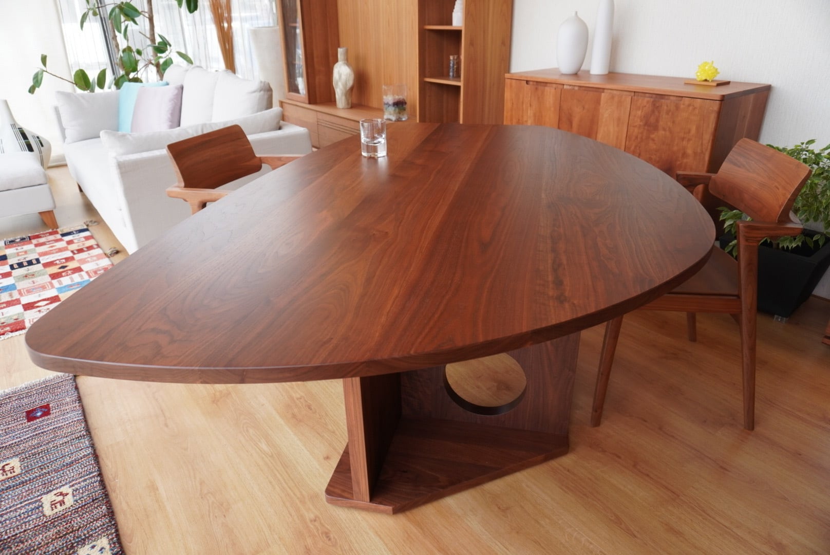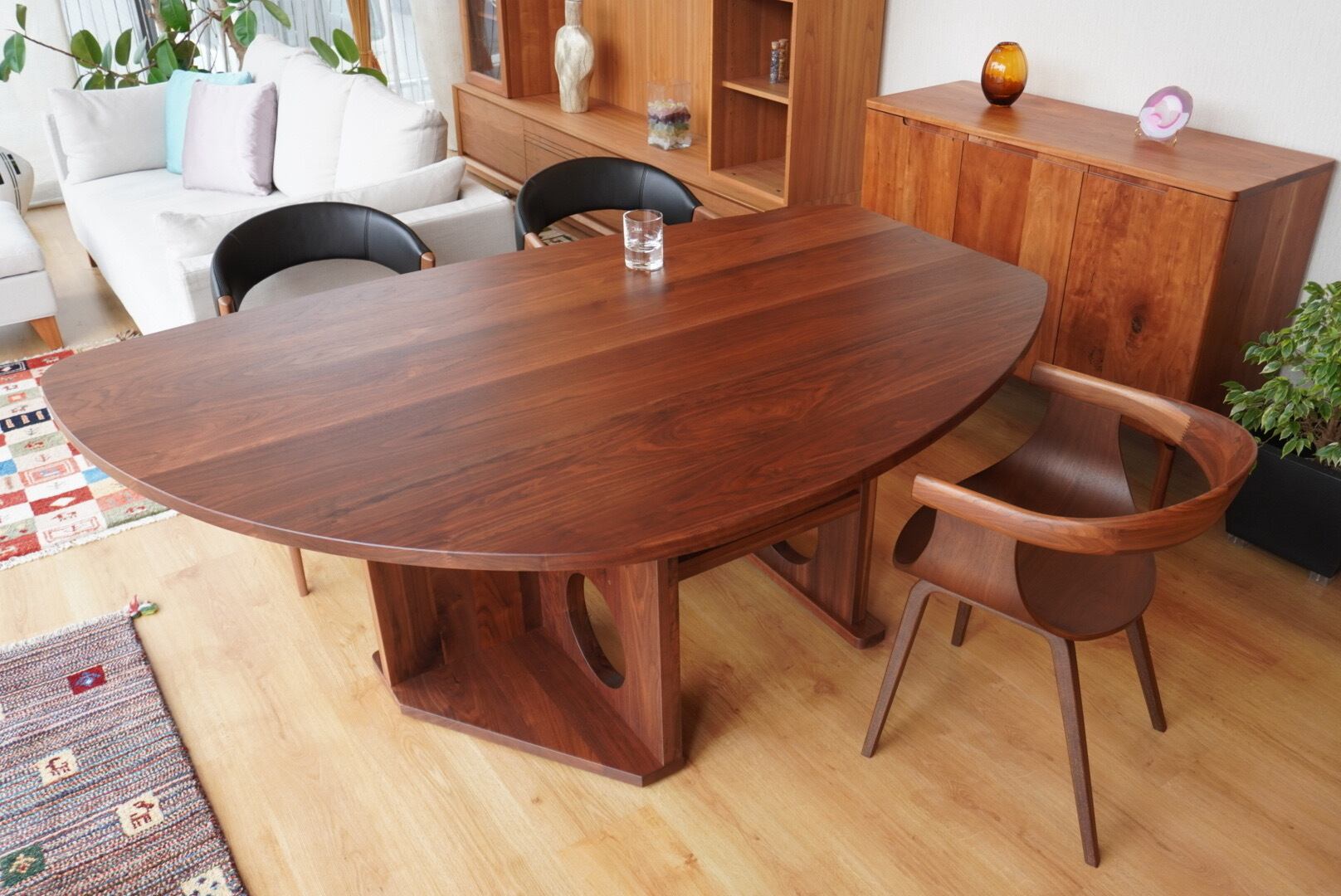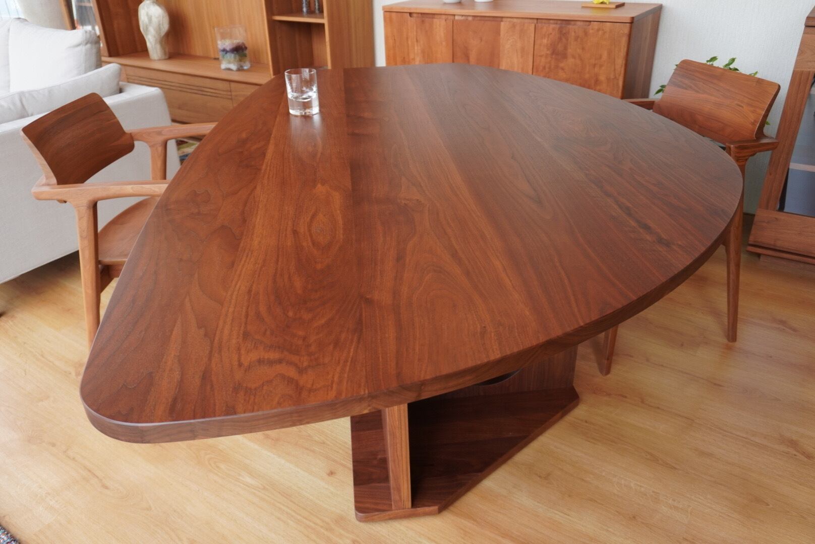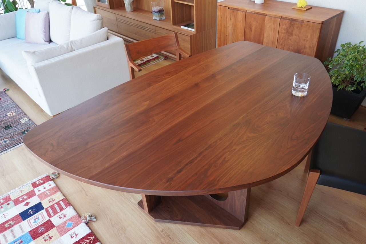 ※ 今、日本の家具小売り市場では、このような変型テーブルは、一般的には【突板(ツキイタ)合板材】で製作するケースが多いようです。