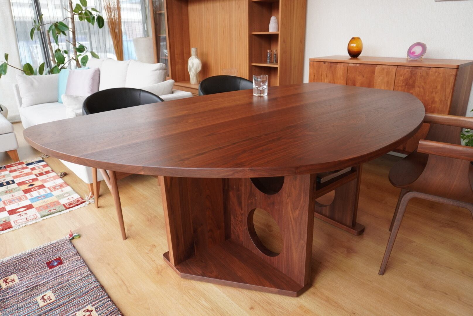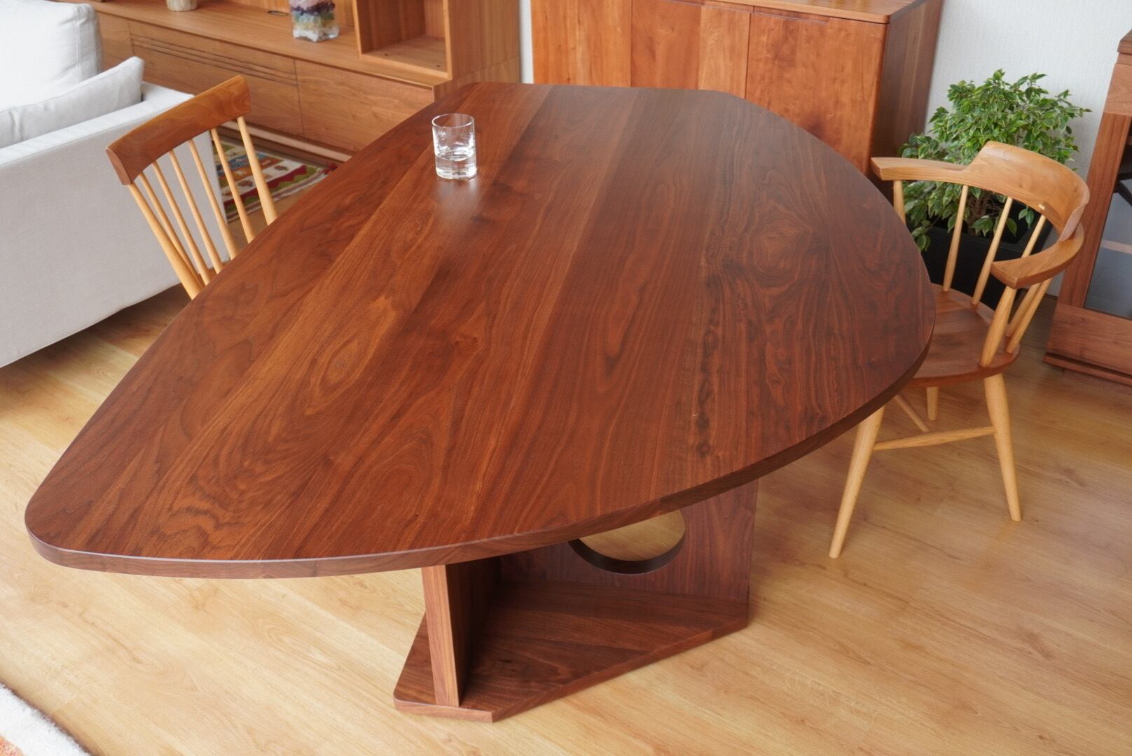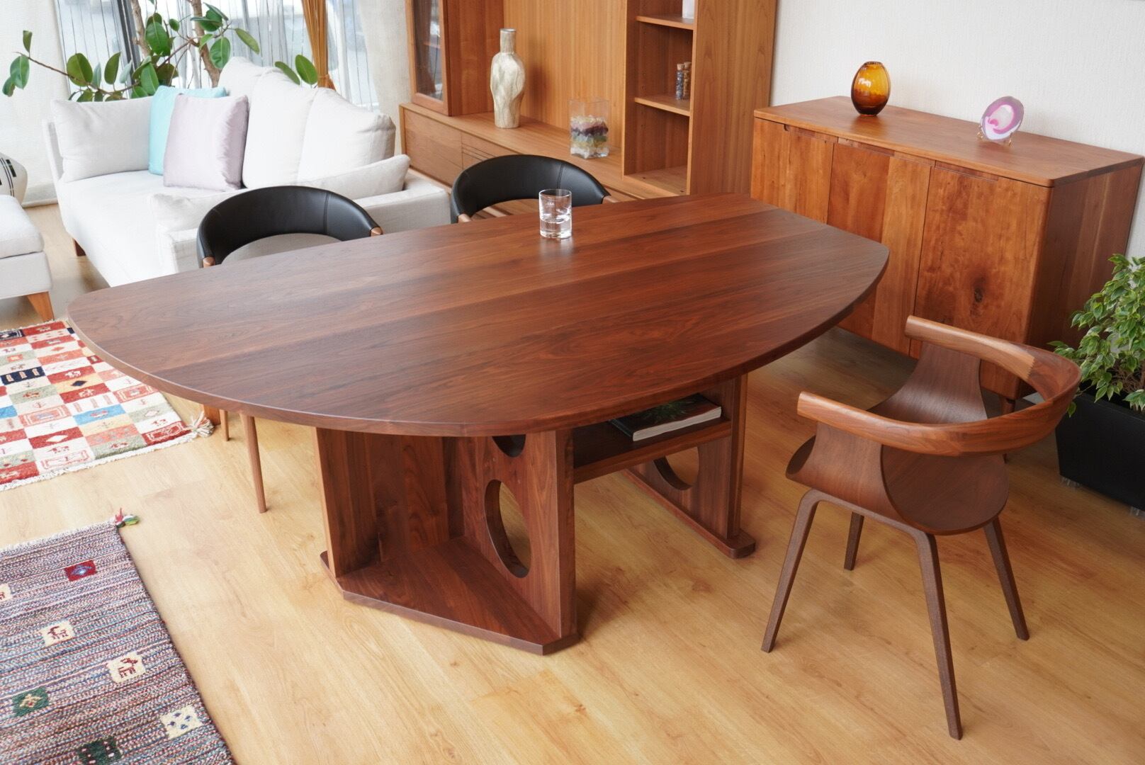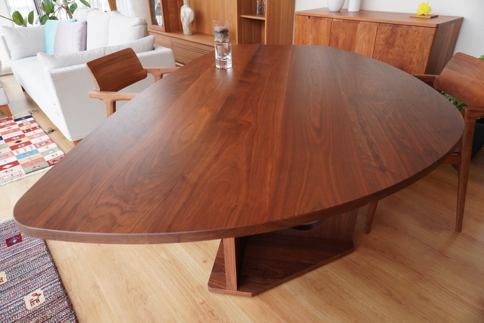 ※ 今、日本の家具小売り市場では、このような変型テーブルは、一般的には【突板(ツキイタ)合板材】で製作するケースが多いようです。