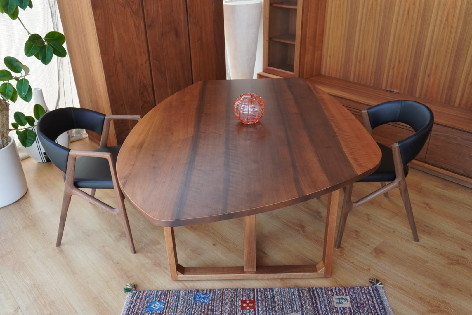 これだけの大きさと形の天板を、無垢材で製作しているテーブルは稀有です。